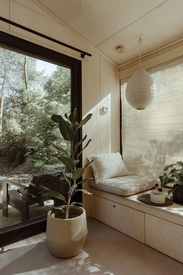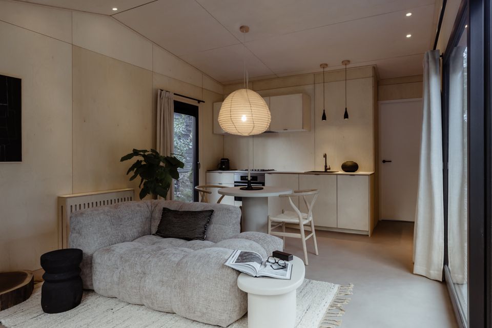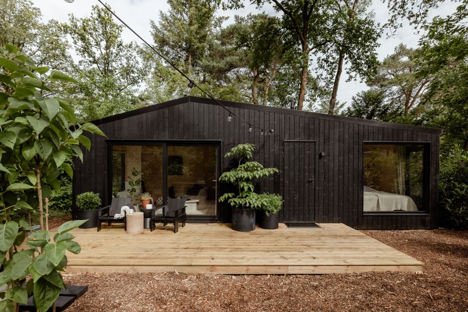 Tiny Oak is een stijlvol tiny house midden in de Veluwse bossen, met een modern interieur van natuurlijke materialen, veel licht en een privéterras.