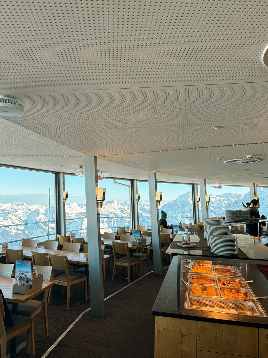Je komt hier met de kabelbaan vanuit Mürren en voelt meteen het avontuur. Het uitzicht op de Eiger, Mönch en Jungfrau is indrukwekkend en verandert langzaam terwijl het restaurant rond draait. Het buffet biedt van alles, gerechten voor een brunch of lunch en zelfs ontbijt. Het bijzondere is dat je tijdens een maaltijd letterlijk twee keer een volledige ronde panoramisch uitzicht meemaakt, een unieke manier om de bergen te beleven. En wie goed oplet, ontdekt kleine James Bond-details die herinneren aan de filmlocatie van On Her Majesty's Secret Service.
