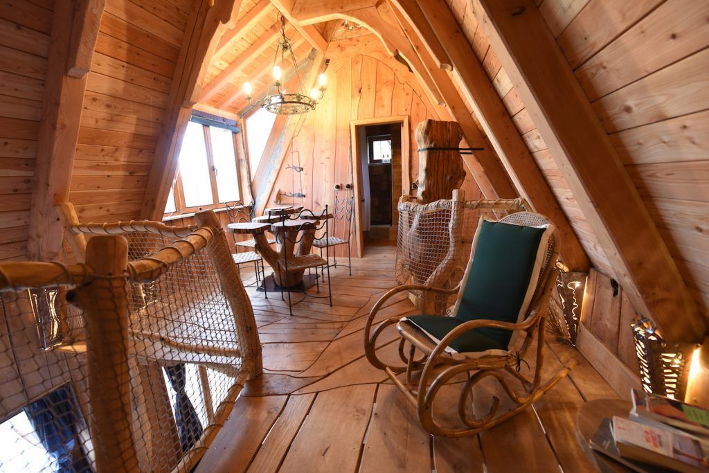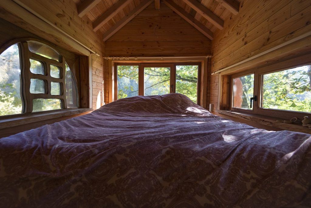 Een houten trap slingert zich tussen de bomen omhoog. Vijf meter boven de grond wacht een knusse boomhut, compleet met groot bed, houten interieur en uitzicht op het kabbelende riviertje. De naam zegt het al: Mon Lit Dans L’Arbre betekent ‘mijn bed in de boom’. En dat is precies wat je krijgt. Elke hut is met de hand gebouwd, van natuurlijke materialen en met oog voor detail. Ruwe stammen en takken lopen dwars door het interieur; je slaapt hier letterlijk midden in de boom.