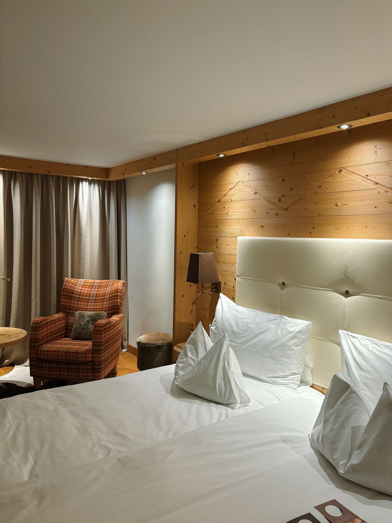 Het tweede hotel waar we slapen is het Les Hauts de Gstaad Golfhotel. Dit hotel draagt Swisstainable Level I. De kamers vloeren warm dankzij de houten meubels, vloeren en wanden en roodgeruite bank en stoel. Dit hotel doet mij denken aan een hotel waar ik ooit vroeger met mijn ouders en zus heb geslapen. Het voelt voor mij als een echte authentieke Zwitserland-ervaring. Als we aankomen is het donker dus pas in de ochtend zie ik de bijzondere omgeving. Houten chalets en besneeuwde bergtoppen. Dit uitzicht gaat nooit vervelen!
