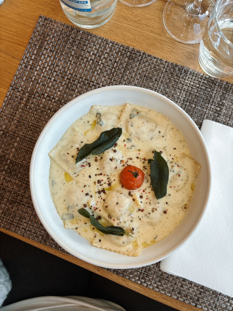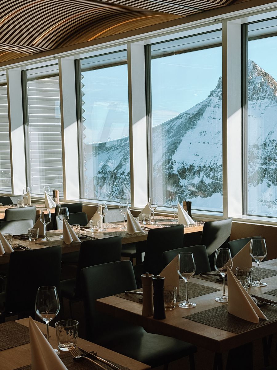 Boven aangekomen starten we met een lunch bij Pilatus Restaurant. Hier schuiven al sinds 1890 gasten aan en ik snap wel waarom. De klassieke inrichting en grote ramen die het landschap naar binnen trekken maken het een fijne plek. We schuiven aan een lange tafel aan en ik voel de zonnestralen op mijn snoet. Vandaag ga ik voor een traditioneel gerecht, namelijk kalfsvlees met groenten, champignonroomsaus en spätzli. Dit is een traditioneel, zacht, ei-rijk deeggerecht gemaakt van bloem, eieren, zout en water.