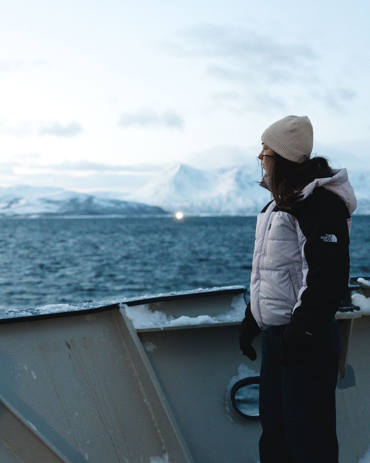 In deze tijd van het jaar komt de zon niet meer boven de horizon. De dagen bestaan uit schemering: een blauwgrijze gloed tussen 11:00 en 14:00 die het landschap zacht maakt. Waar sommigen de poolnacht zwaar vinden, ervaarde ik het als magisch. Soms was het zó mooi dat het bijna surrealistisch voelde. Bergen die zacht oplichten, sneeuw die roze en paars kleurt, en een stilte die in de fjorden aanwezig was.